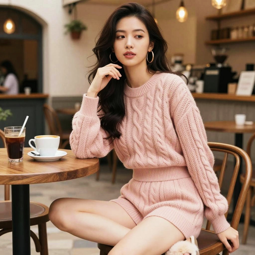 A svelte woman in a dusty pink cable knit sweater and matching high-waisted shorts, large hoop earrings, and fuzzy open-toe slippers, with long dark hair in loose waves and simple makeup, enjoying a relaxed moment at a trendy coffee bar in a quaint village, captured in the visual style of Tuttle Publishing. Sexy. Pretty face and beutiful eyes