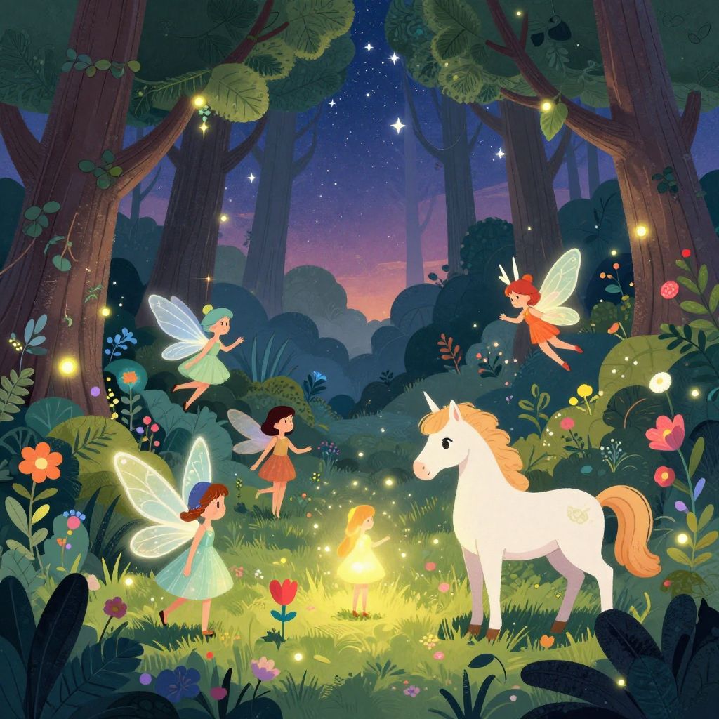 A vibrant, digital illustration depicts a magical forest at twilight. Three fairy-like children with translucent wings, wearing light-colored dresses, gather around a glowing campfire. One fairy with red hair and a blue dress stands to the left, another with brown hair and a green dress stands in the center, and a third with orange hair and a red dress hovers to the right. A white unicorn with a pink mane and tail stands nearby. The background features tall, dark trees, a starry sky, and colorful flowers. Fireflies and soft, yellow light from the campfire illuminate the scene, creating a whimsical, enchanted atmosphere.