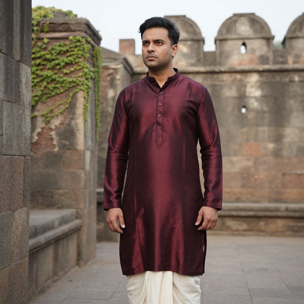 A man, deep maroon silk kurta, cream cotton dhoti, subtle paisley patterns, elegant drape, ancient stone walls, overgrown ivy, crumbling battlements, camera obscura style, contemplative expression. Man has masculine face and piercing eyes