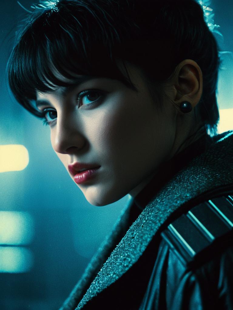 Close-up portrait of a young woman dressed in a Blade Runner inspired Joi costume, featuring detailed photorealistic tones. The subject has dark hair styled in a neat updo with bangs, wearing a textured black leather jacket. The lighting creates a moody, futuristic atmosphere with blue and orange highlights.