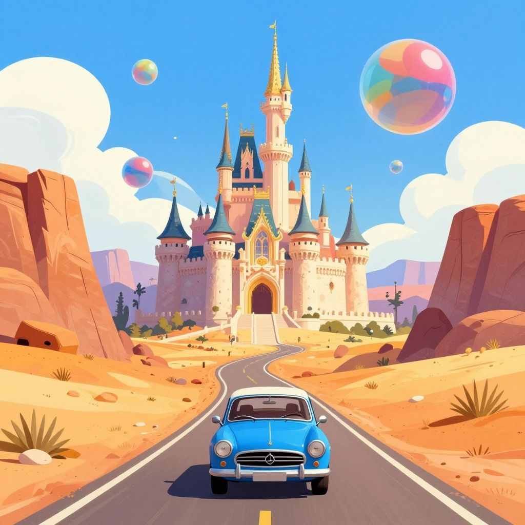 A whimsical vintage car adorned with vibrant floral patterns defies gravity as it glides effortlessly along a cracked, rainbow-colored road that stretches endlessly into a serene desert landscape beneath a dreamy sky.