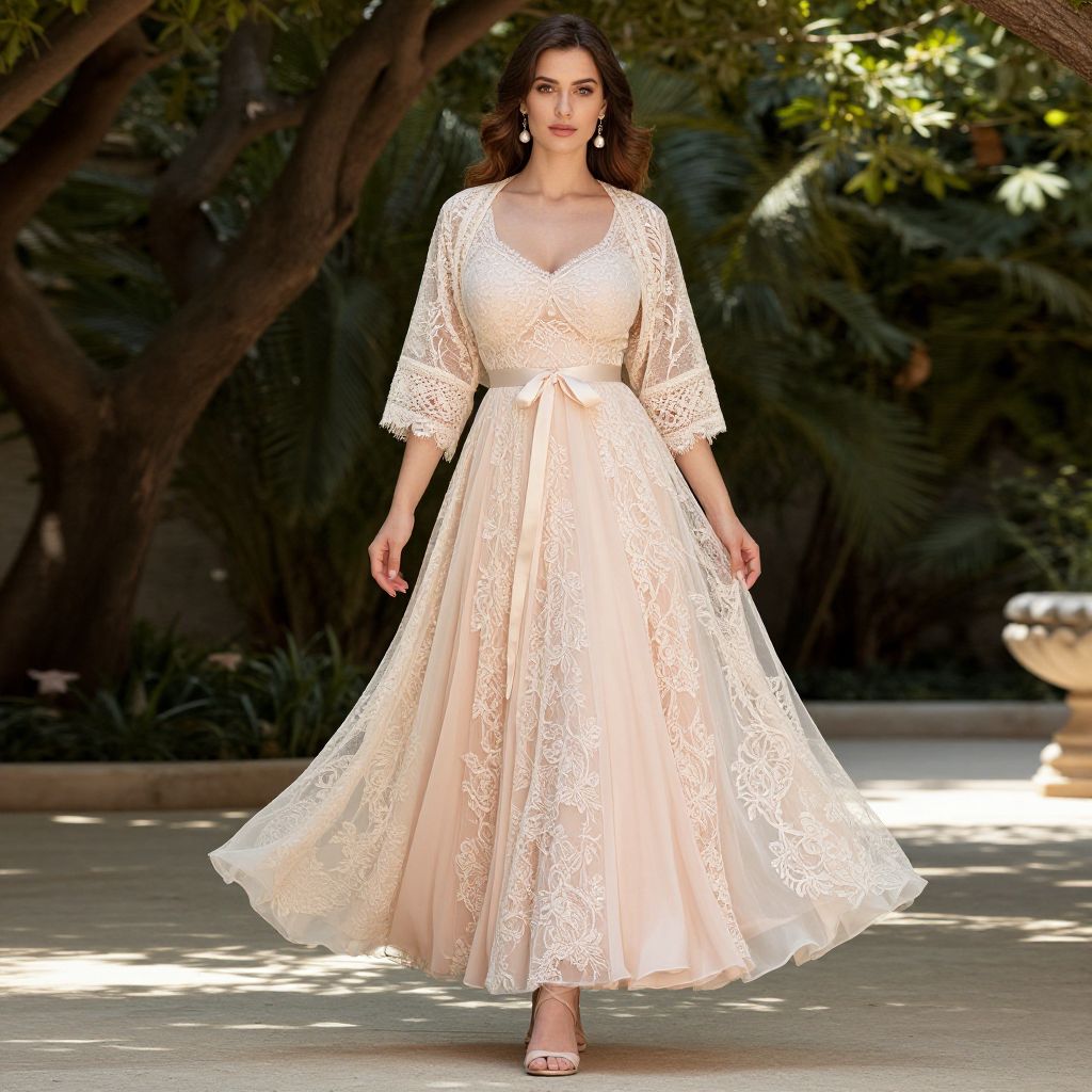 Photograph of a beautiful woman with dark hair, wearing a flowing, cream lace dress with a V-neck, standing outdoors in a sunlit garden.