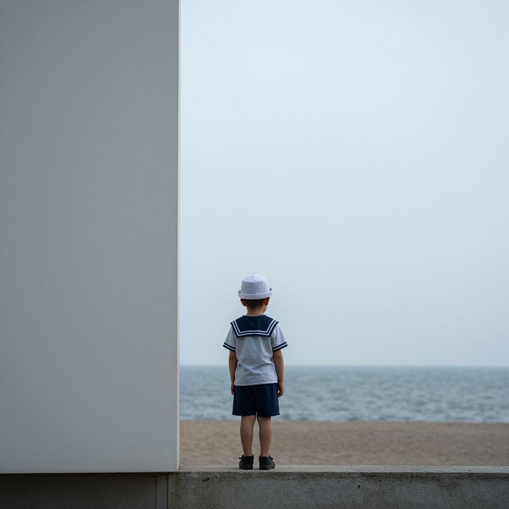 Minimalist Architecture 5 year old boy wearing a sailor costume and dixie cup hat looking out at the sea, ultra realistic, melancholic, dramatic,