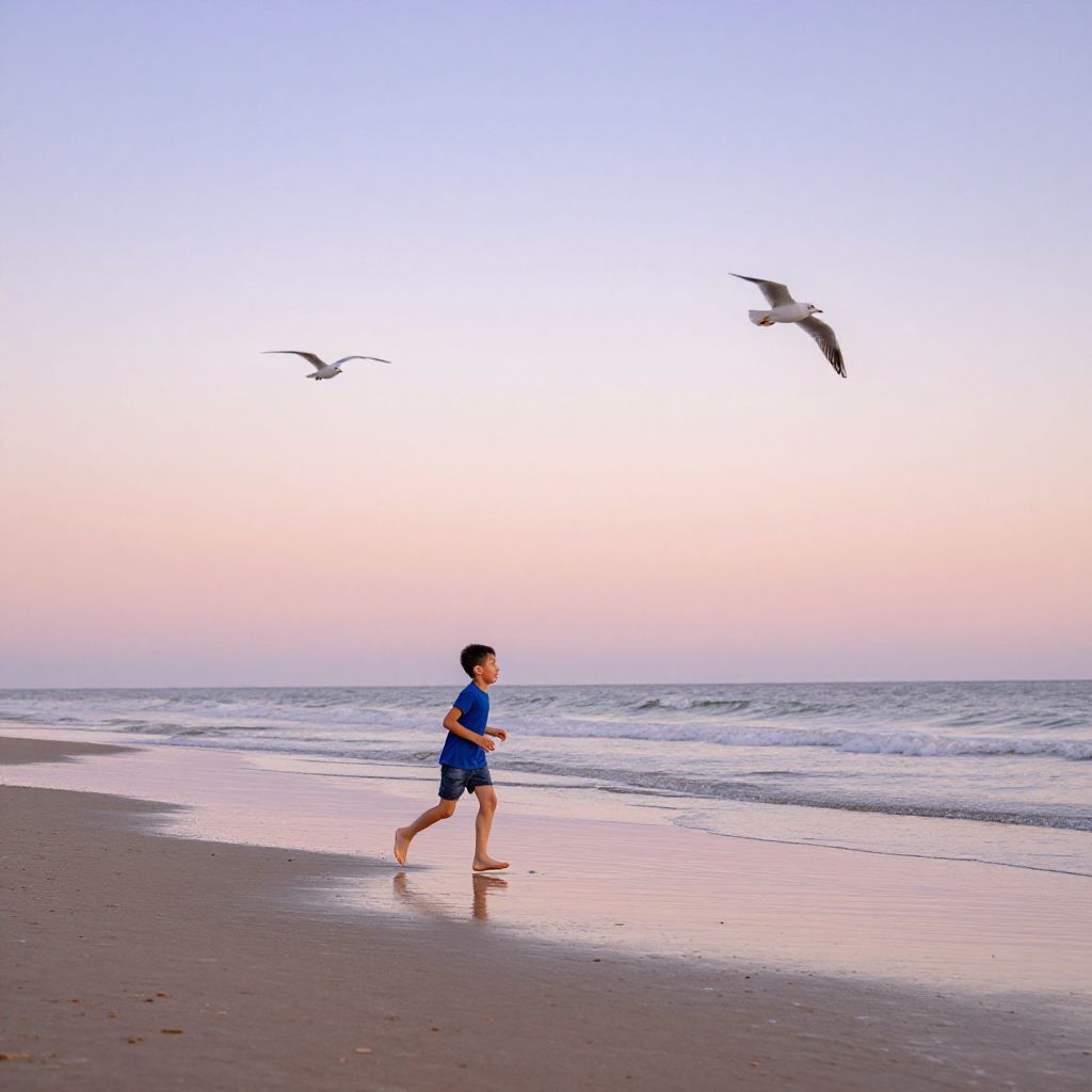 Photograph of a young boy standing on a concrete ledge, facing away from the camera towards a foggy beach. He wears a white sailor-style shirt with black stripes, black shorts, white bucket hat, and black shoes. The left side of the image is dominated by a large, plain white wall, while the background shows a misty, grayish-blue ocean and foggy sky. The beach below has a sandy, brownish texture. The boy's small figure contrasts with the vast, overcast horizon. The overall mood is serene and contemplative.