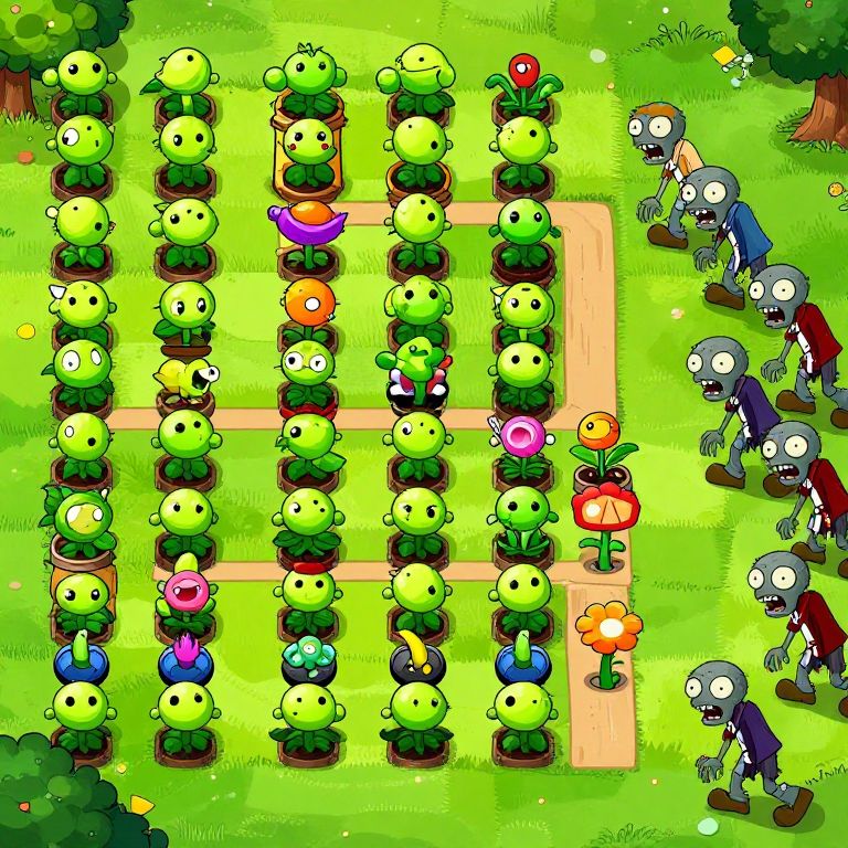 Illustration of pvz tower defense game gameplay with cute plants arranged like towers on grid lawn, zombies approaching from right side, large variety of plant defenses active, lively and colorful comic style, emphasizing strategic defense mechanics