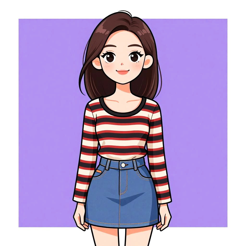 This digital drawing in a colorful anime style features a young woman with fair skin and long, dark brown hair. She is wearing a large, gray, cable-knit cardigan with black buttons over a black lace-trimmed top. Her black, diamond-patterned tights complement the outfit. She stands against a solid lavender background with a white border, smiling gently with a slight blush on her cheeks. Her large, black eyes and small nose are characteristic of anime art, adding a cute, approachable vibe to her appearance.
