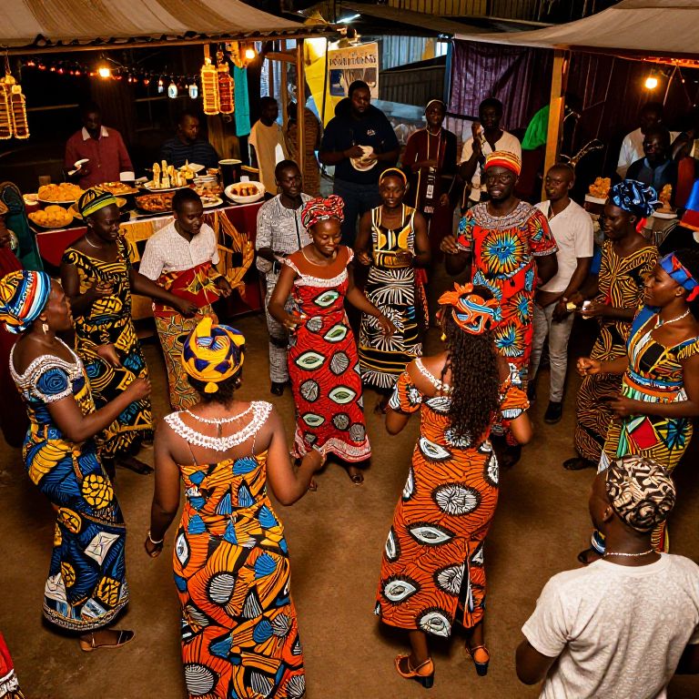 Mandingo party filled with cultural elements, people wearing bold patterned fabrics, animated dancing, rich textures, festive food and drink stalls, lively music creating an immersive celebration