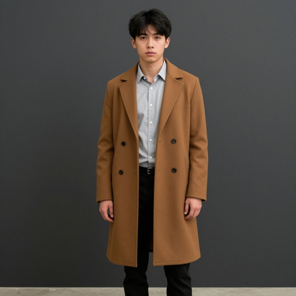Photograph of an East Asian man with short, slightly messy black hair, standing against a solid dark gray background. He wears a light brown, double-breasted overcoat with black buttons, over a white dress shirt with a black tie. The overcoat is long, reaching just below his knees. He also wears black pants, visible at the bottom of the frame. His expression is neutral, and he stands with his arms relaxed at his sides. The image is well-lit, highlighting the textures of the coat and shirt.