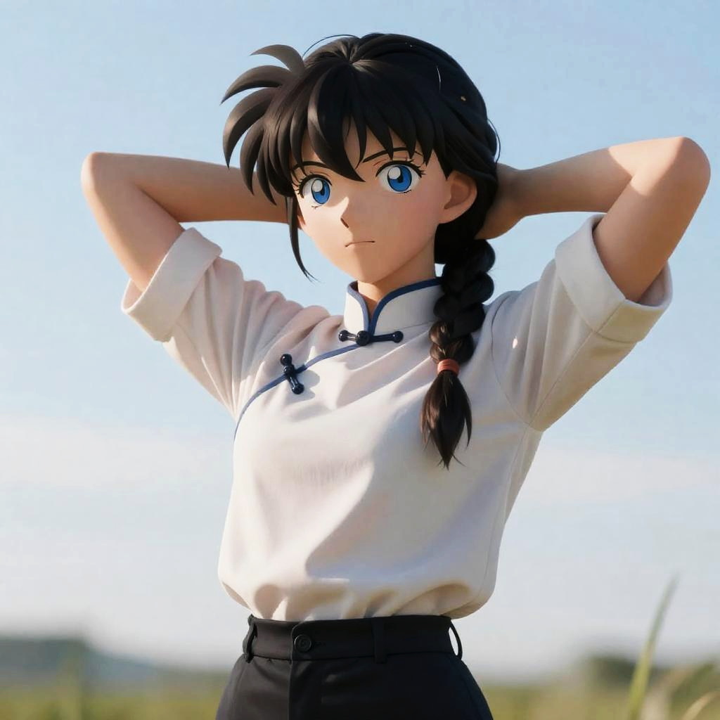 HDR, CG, sharp focus, (8k), (4k), (Masterpiece), (Best Quality), fantasy, extremely detailed, intricate, hyper detailed, (perfect face), soft lighting, (specular lighting:1.2), highres, absurdres, (realistic:1.2), (photorealistic face:1.2), ranma-chan, 1girl, solo, blue eyes, bangs, tangzhuang, braided ponytail, sleeves rolled up, black pants, black footwear, standing, sky, day, grass, arms behind head, cowboy shot