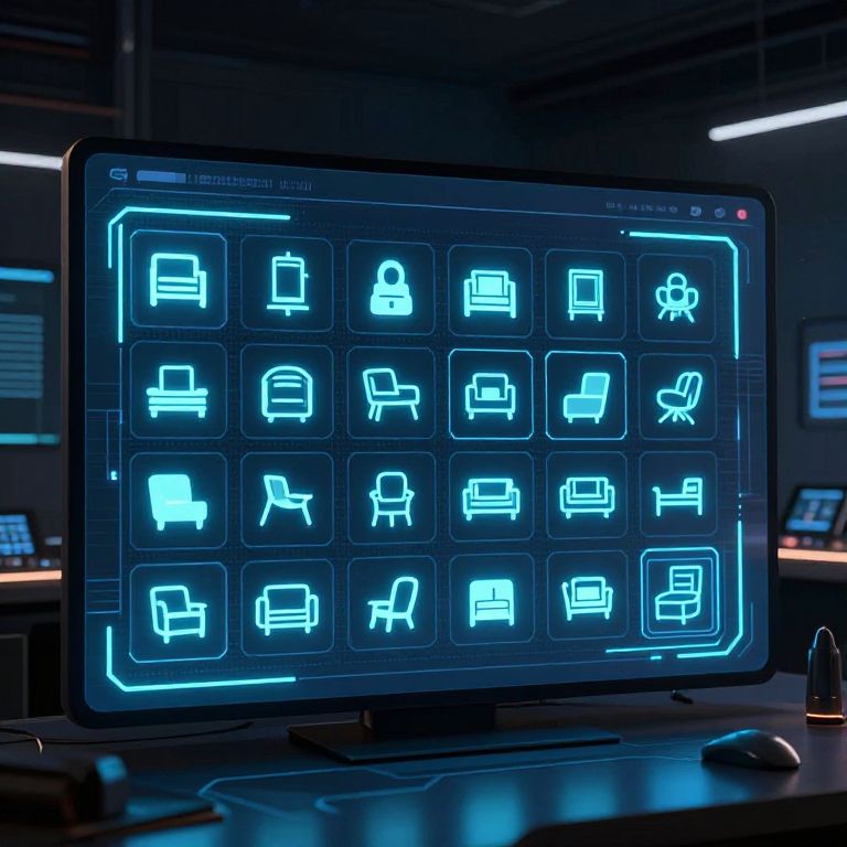 Photograph of a sleek, modern computer monitor displaying a grid of 16 glowing, neon-blue icons, each representing different furniture items like chairs, tables, and lamps. The icons are outlined in a digital, futuristic style. The monitor is centered on a dark, reflective desk, with a keyboard and mouse partially visible in the lower right corner. The background is dimly lit, with other monitors and screens slightly out of focus, suggesting a high-tech, possibly industrial or office setting. The overall ambiance is cool and futuristic, with a strong emphasis on digital technology.