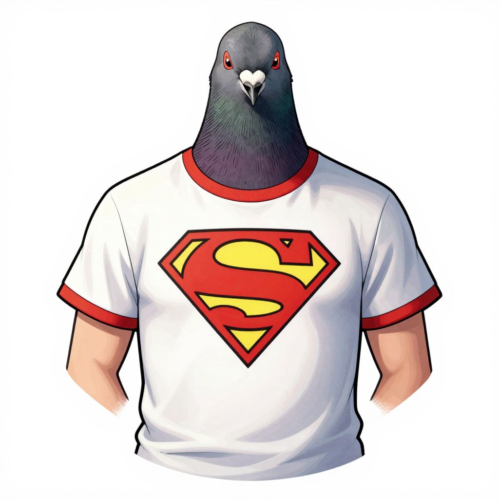 Digital illustration of a black pigeon with red eyes, wearing a white Superman T-shirt with a red and yellow "S" logo.