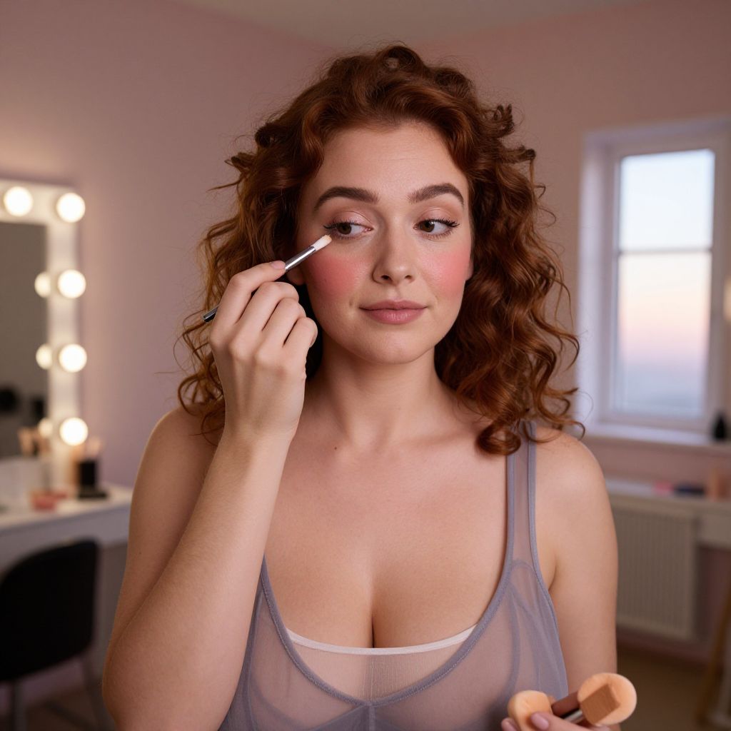 Close-up portrait of a woman in her early 30s with curly auburn hair and a gentle, thoughtful expression, standing in a dimly lit dressing room with soft pastel lighting. She is mid-way through applying makeup—her cheeks are lightly flushed with pink foundation and her lashes are being curled. A half-applied bronzer streaks her right cheekbone, and her eyebrows are gently shaped. The scene captures a natural, unpolished vibe with visible tools like a cotton swab and a makeup sponge. She wears a sheer, fitted dress over a cotton underlayer, the neckline slightly unfastened. The room is organized but personal, with small mirrors and a window letting in a soft morning glow.. The woman has big tits and cute face
