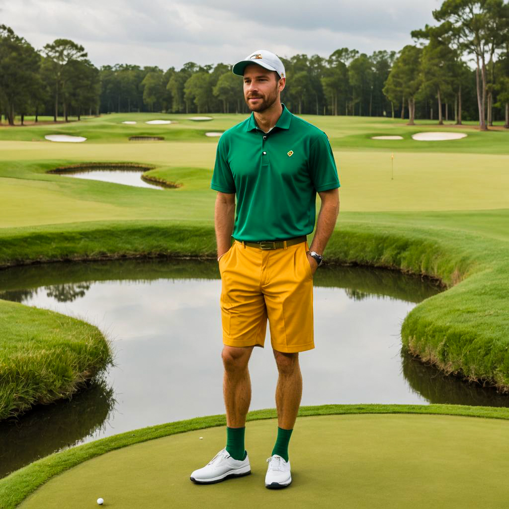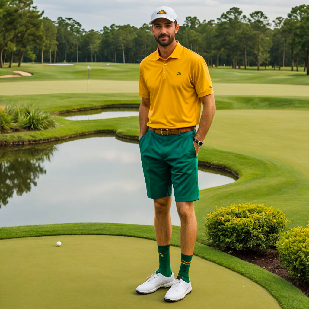 Portrait of a young man with a beard wearing a yellow polo shirt, green shorts, and green socks standing on a putting green at a golf course. He is also wearing a white visor cap, white golf shoes, and has his hands in his shorts pockets. The background shows a fish pond, manicured grass, trees and a golf flag on the green.