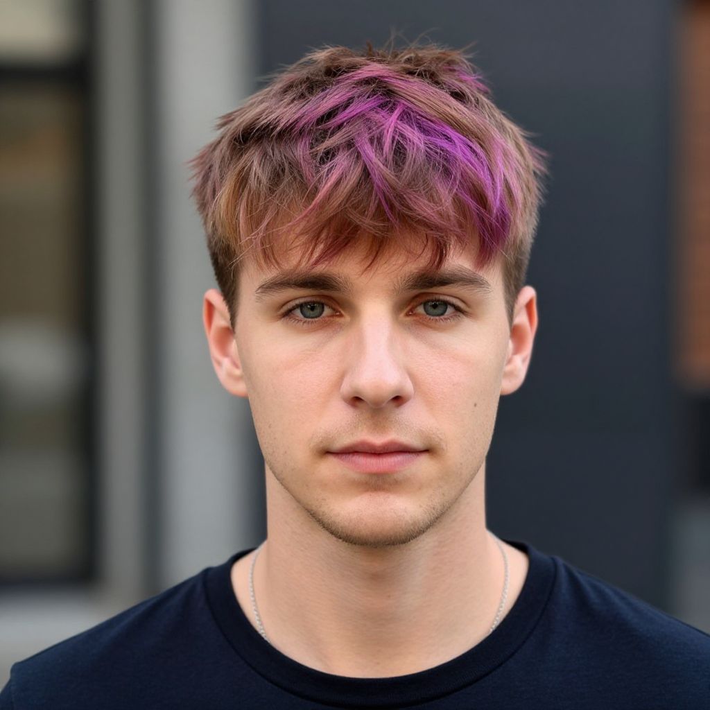 Colored tips on a fit European man, realistic photography, vibrant hair colors blending naturally, soft lighting highlighting the contrast between hair and skin, casual urban setting with a modern vibe, sharp focus on facial features and hair details
