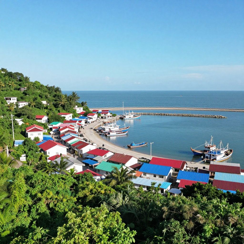 Photograph of a coastal village with colorful houses featuring red, blue, and green roofs. The village is nestled among lush greenery and hills on the left. A small sandy pier extends into a calm blue sea on the right, where several white fishing boats are anchored. A breakwater runs parallel to the pier, separating the calm inner water from the open sea. The sky is clear and bright blue, reflecting the sunny weather. The overall scene is vibrant and picturesque, with a mix of natural and man-made elements.