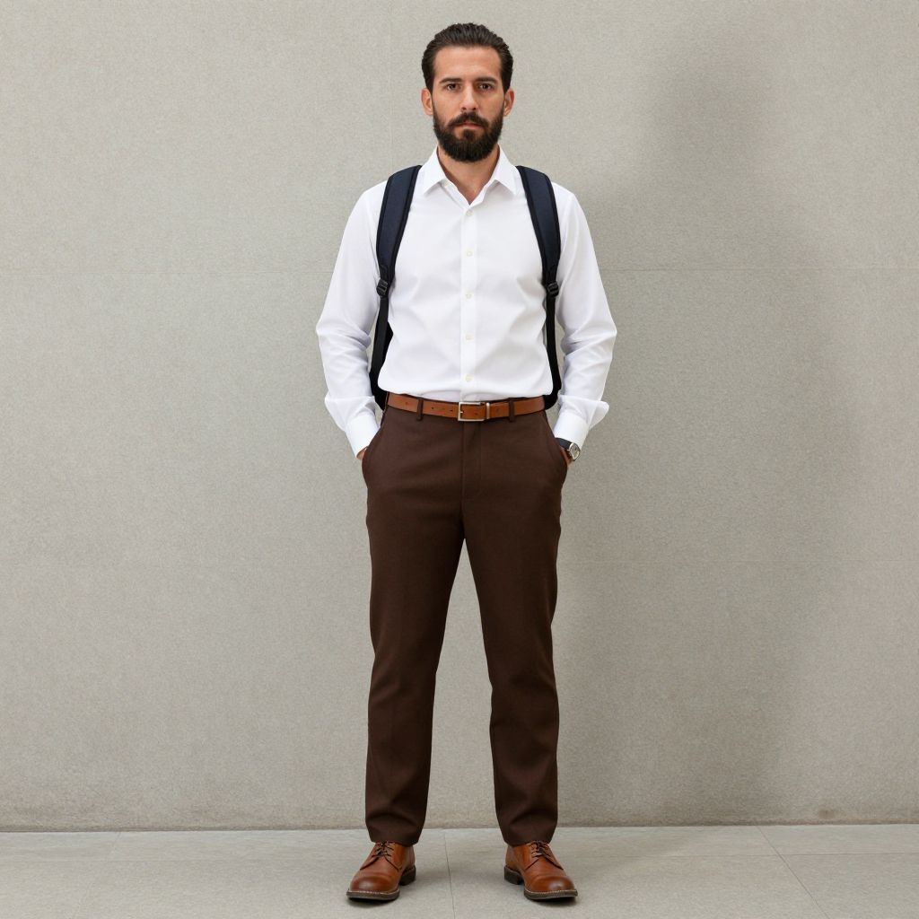 Statement menswear costume, 1boy, male focus, solo, facial hair, shirt, white shirt, hands in pockets, brown footwear, pants, full body, beard, standing, belt, collared shirt, shoes, looking at viewer, mustache, bag, long sleeves, backpack