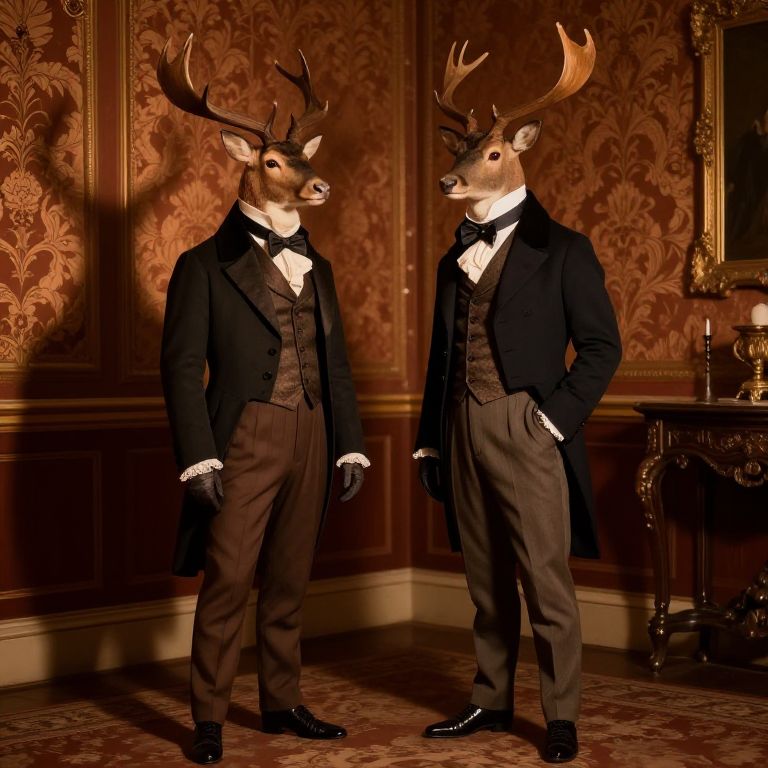 Victorian animals in clothes, a regal stag wearing a tailored frock coat and ascot tie standing amidst an ornate drawing room with intricate wallpaper, warm shadows, rich textures, detailed fabric folds, classic Victorian fashion.