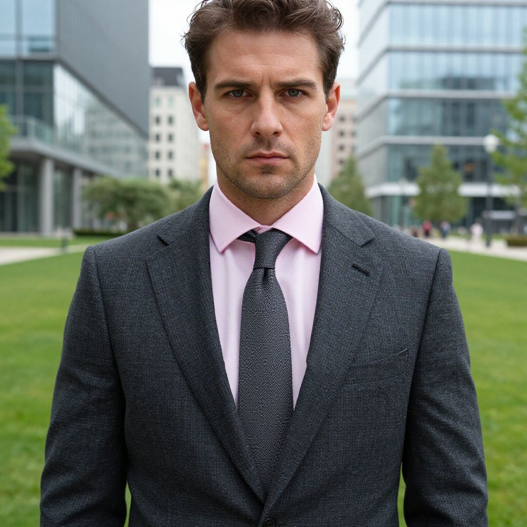 A man, charcoal grey check suit, structured wool, light pink shirt, textured dark grey tie, modern glass buildings, vibrant green spaces, camera obscura style, contemplative expression Man has masculine face and piercing eyes