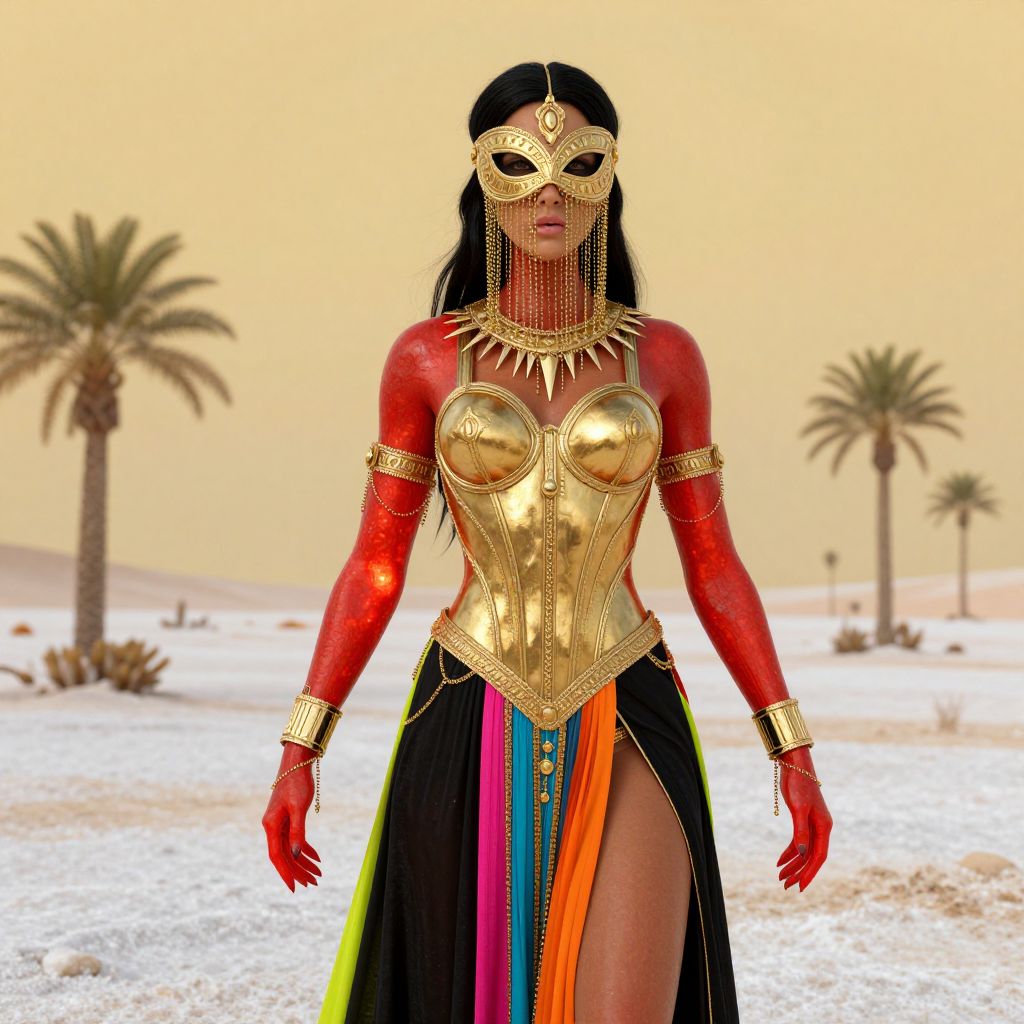 A hyper-realistic mid-shot portrait of an ancient feminine deity, rendered with a Canon EOS-1D X Mark III DSLR, set to f/2, 8 aperture for a balanced depth of field and ISO 100 for clarity, using a 50mm prime lens to capture intimate details, Clad in intricate, form-fitting golden armor, her look is divine and fierce, with a long black skirt featuring a side slit and vertical stripes in fluorescent green, electric blue, hot pink, orange, and lime yellow, Her eyes are obscured by a surreal gold mask with intricate patterns and approximately 200 thin chains cascading down, forming a golden chin pad adorned with pointed spikes, enhancing her regal aura, Her glowing crimson-red arms, adorned with golden bangles and chains, stand out dramatically against a light-yellow backdrop, Captured with Octane Render and enhanced in Adobe Photoshop for extreme detailing, every element is sharply defined, from the deity’s radiant glow to the textures of her armor, The background features a surreal desert scene of salt-white sand, rendered in high detail with distant palm trees and sparse desert flora, lending a mystical, exotic touch, Bathed in a soft light yellow hue, the landscape heightens the deity’s vivid colors, blending elegance, strength, and mysticism in a captivating portrait