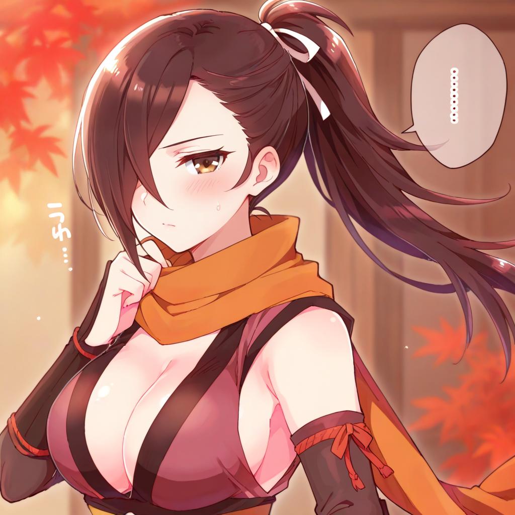 Kagero (fire emblem), fire emblem, 1girl, brown eyes, hair over one eye, brown hair, long hair, ponytail, large breasts, cleavage, ninja, by artist sorimachi-doufu, illustrious