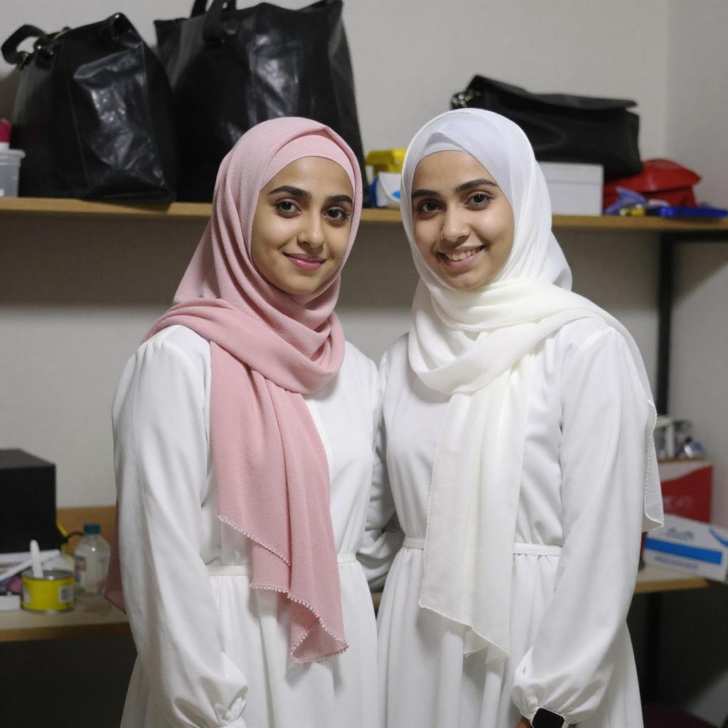 Photograph of two young women standing close together in a cluttered room. Both wear hijabs, one pink and one white, and long-sleeved white dresses. They smile at the camera, with the pink-hijab woman on the left and the white-hijab woman on the right. Shelves with black bags and miscellaneous items are in the background.