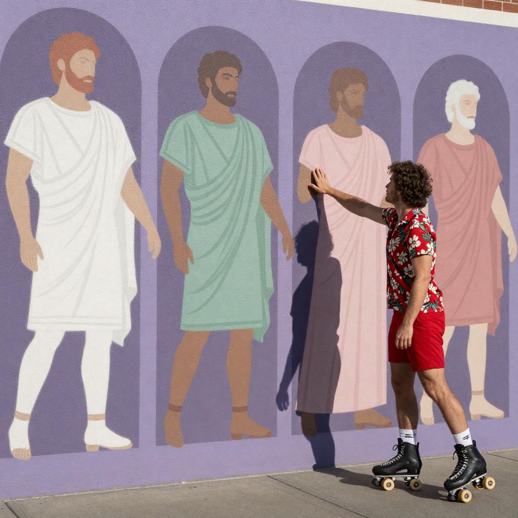 Young man with shaggy hair, red patterned shirt, shorts, black platform shoes, and white socks walks past a purple mural. The mural features classical figures in pastel colors, illuminated by neon lights. His shadow falls on the ground. Urban alleyway.