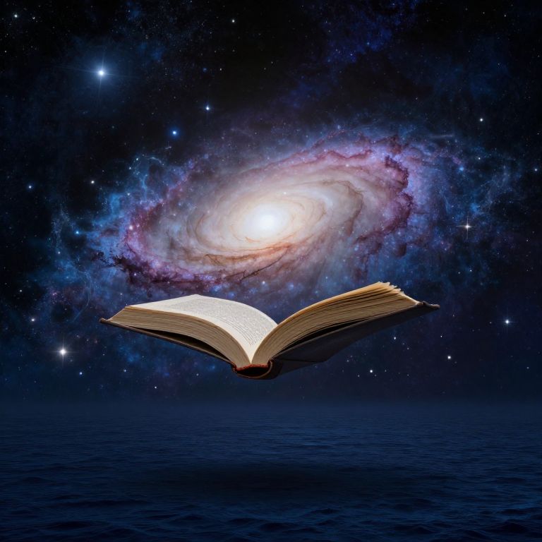 Suspended between the cosmic expanse and the boundless sea, a galaxy of books floats serenely, their pages whispering stories that ignite the imagination and connect the infinite depths of the universe with the quiet mysteries of the soul.
