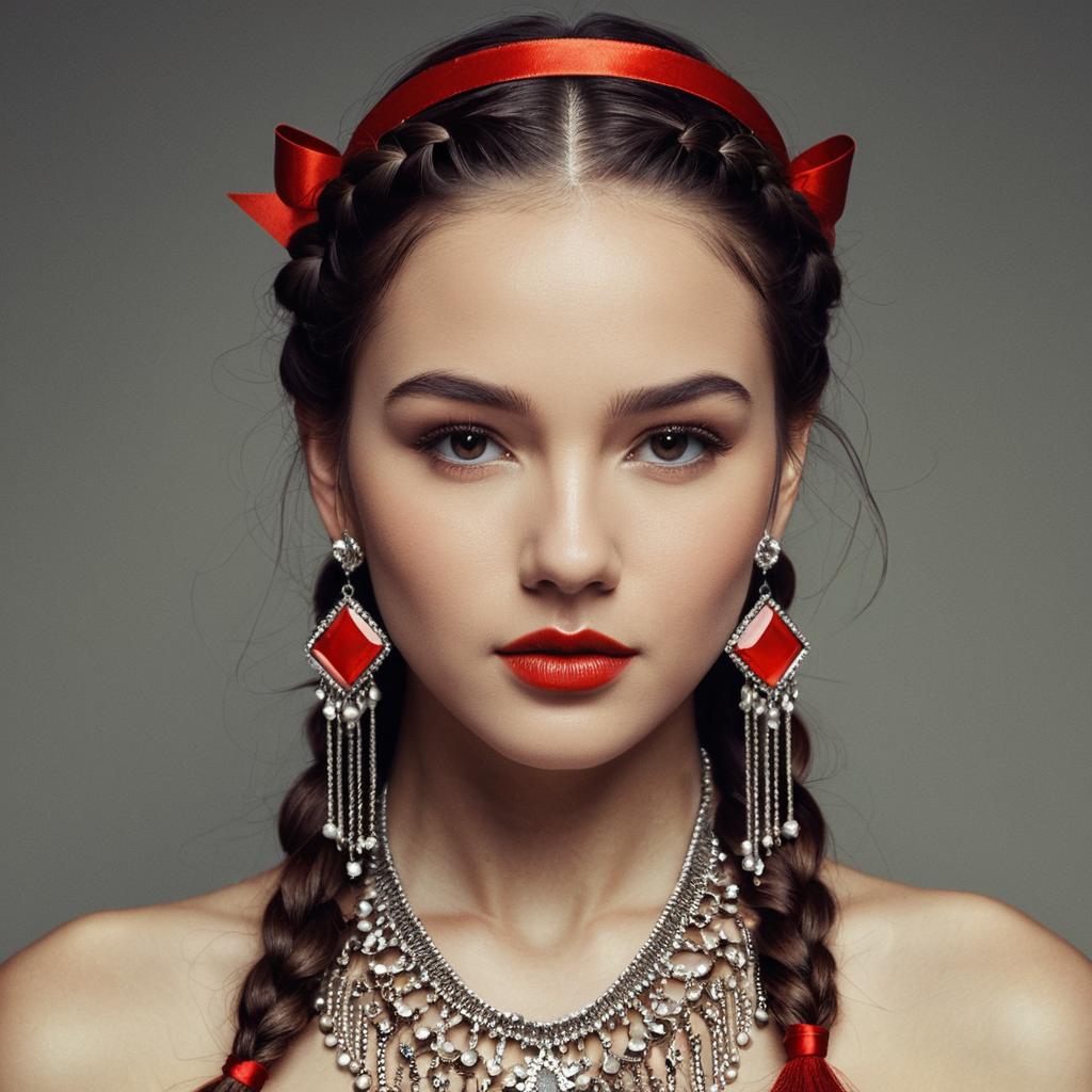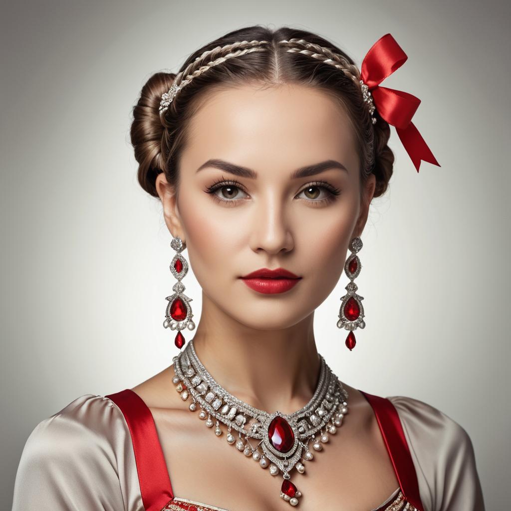 Portrait of a young woman with fantasy elegance wearing intricate jewelry, including a large red gemstone necklace and matching dangling earrings. Her hair is styled in braided silver strands adorned with a red ribbon bow, complementing her smooth skin and subtle makeup. She is dressed in an elegant, slightly metallic fabric with red satin straps, against a muted neutral background with soft lighting highlighting detailed facial features.