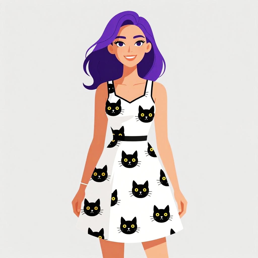 Digital illustration of a smiling woman with purple hair wearing a white dress with black cat faces, standing against a white background.