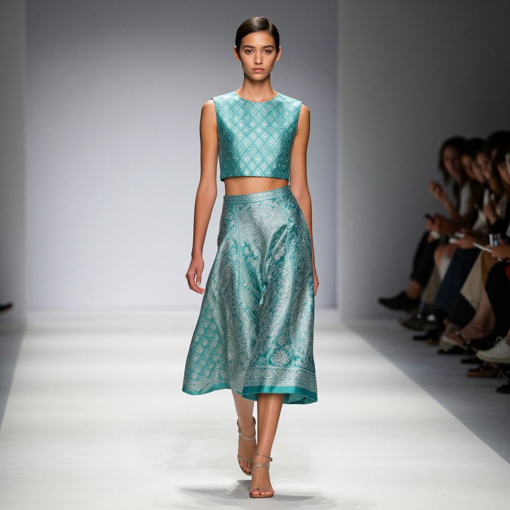 Photograph of a slim, dark-haired model walking down a white runway. She's wearing a teal, sleeveless crop top with a diamond pattern and a matching full skirt with intricate silver designs. Her midriff is exposed, and she's wearing strappy sandals. The background is a simple, gradient white to gray, with blurred audience members on either side. The overall vibe is elegant and modern.