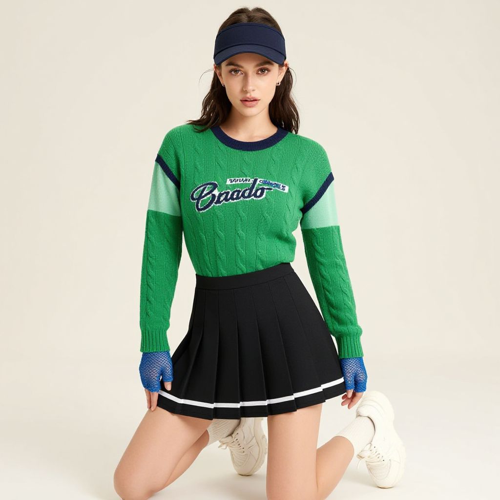 "Woman, sporty chic, layered ensemble, green cable knit sweater with navy trim over graphic print T-shirt, pleated mini skirt with black and white stripes, blue fishnet fingerless gloves, white chunky sneakers, navy visor cap, posed in a studio setting with a plain light background.. Sexy. Pretty face and beаutiful eyes. Big breasts."