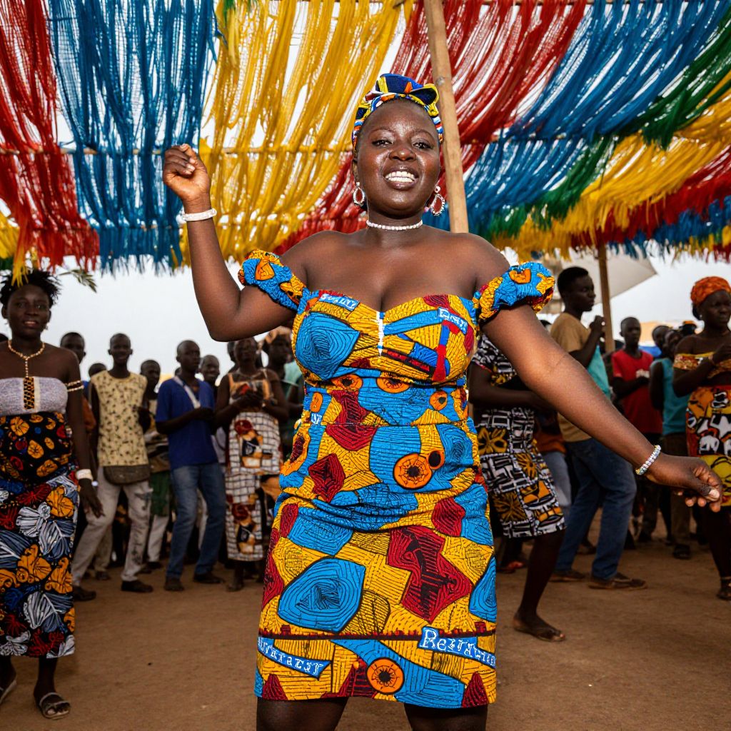 A dynamic shot of an African woman in a traditional African styles woman costume during a cultural festival, wearing a brightly colored ceremonial dress with symbolic patterns, her face glowing with pride and joy, dancing under a colorful canopy of palm fronds in a festive setting in Senegal.. The woman has big tits and cute face