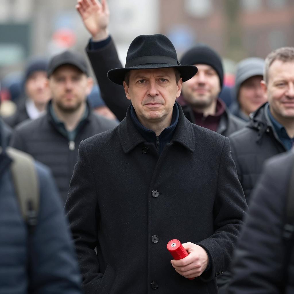 Crowd scene, photograph. Front: middle-aged white man with short brown hair, black hat, black coat, holding red object in left hand. Background: diverse men in hats, coats, one raising right arm, smiling. Urban setting, daytime. 8 people visible.