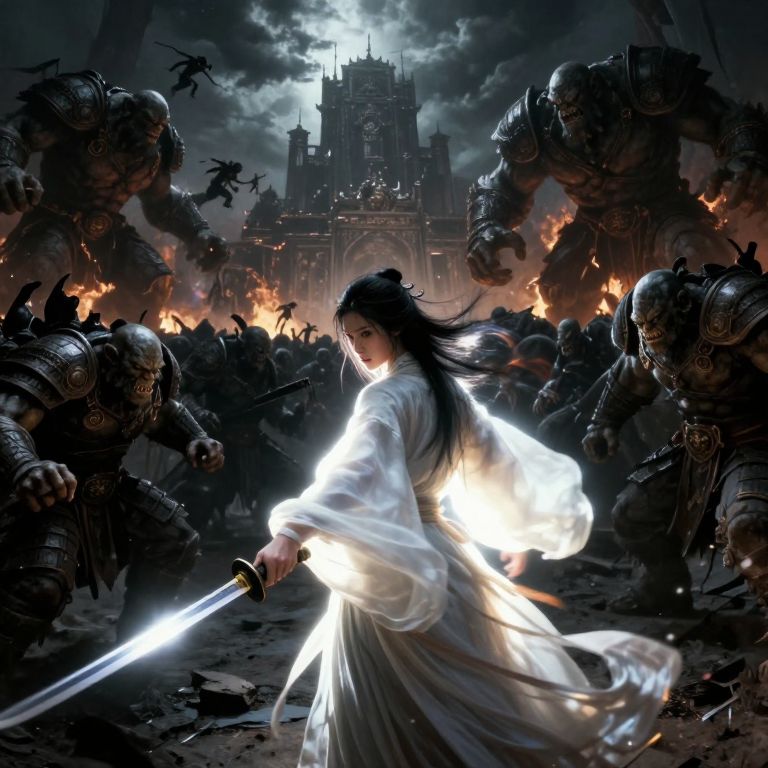 Digital painting of a dark-haired woman in a white robe wielding a glowing sword, surrounded by armored, monstrous warriors in a fiery battlefield, with a go