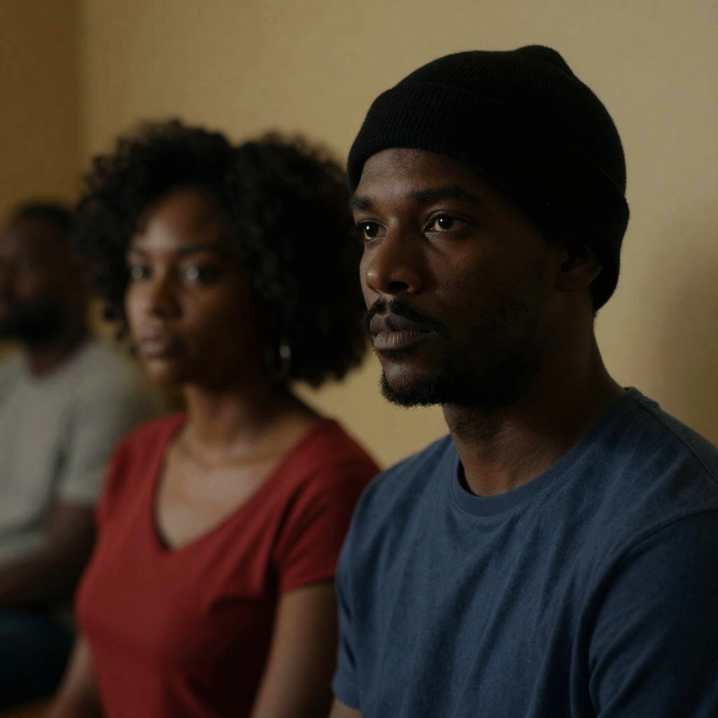 Photograph of two people in a school hallway. Black man with glasses, black beanie, lavender ruffled shirt, black vest, and high-waisted black pants leans against a brick wall, holding a yellow booklet. Black woman with curly blonde wig, black strapless top, and large beige feather boa stands to his right. Background includes a crowd of people, a green door, and a red "STAY" sign.