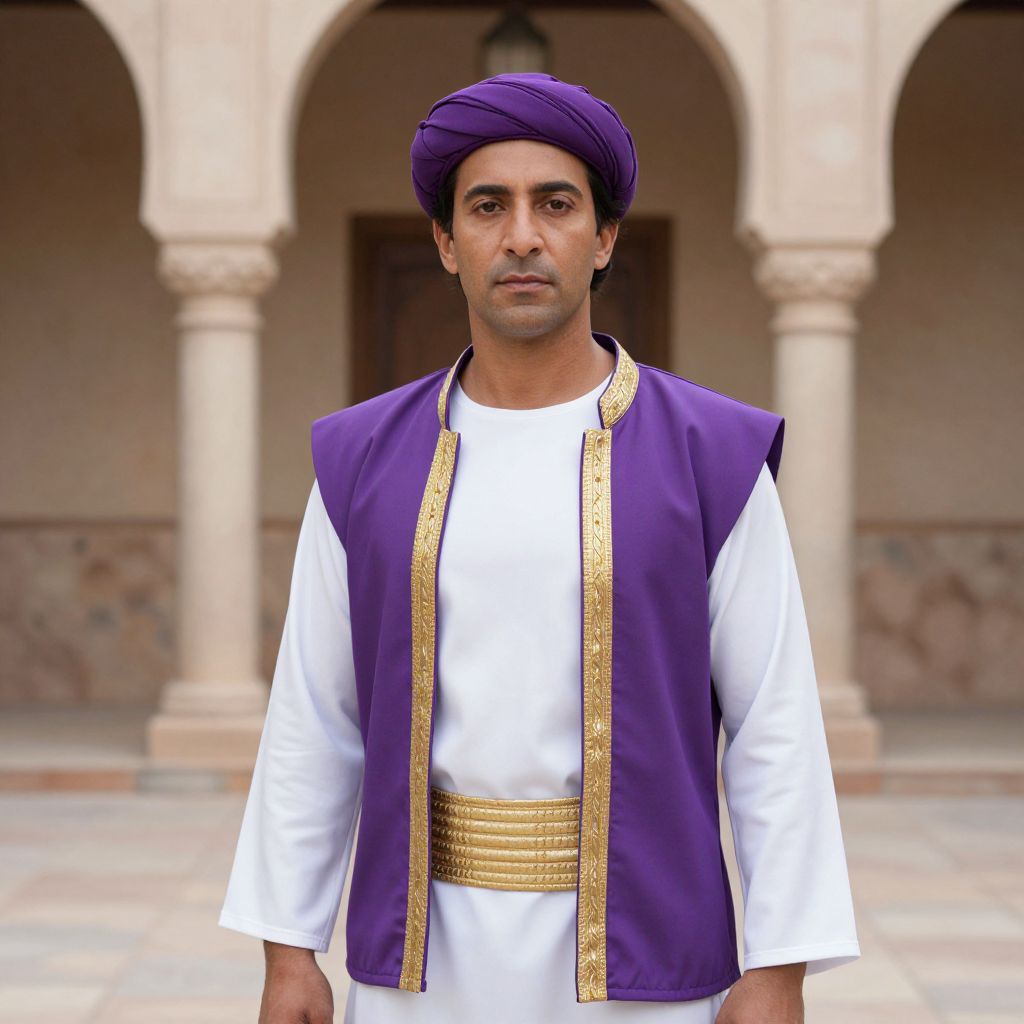 Purple Vest Man Aladdin Costume, man in purple turban and purple jacket standing in front of a building