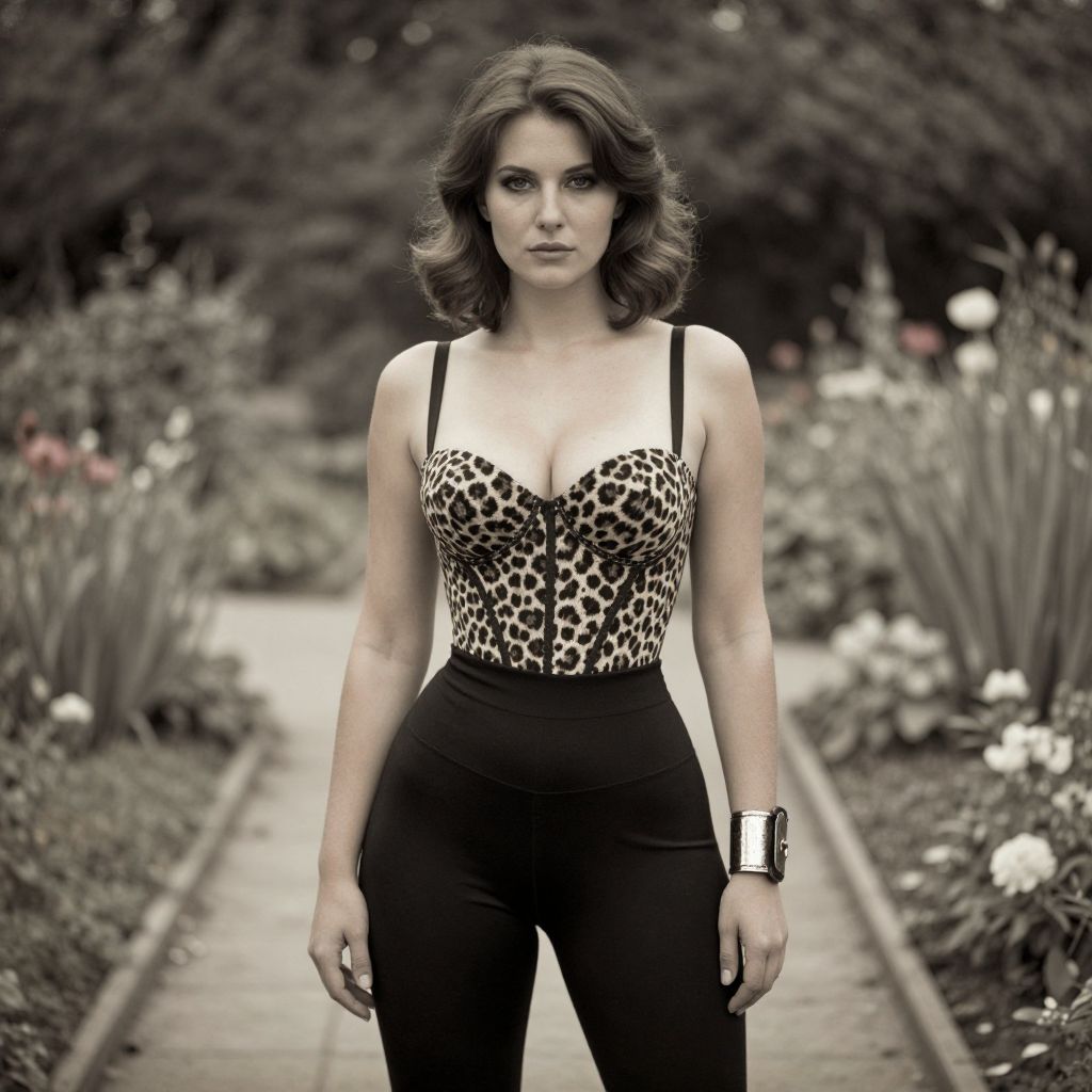A svelte woman in a chic leopard print bustier and high-waisted black leggings, adorned with a metallic wrist cuff, captured in the soft, vintage tones of the Calotype process, standing in a flower garden with a stone pathway. Sexy. Pretty face and beаutiful eyes. Big breasts