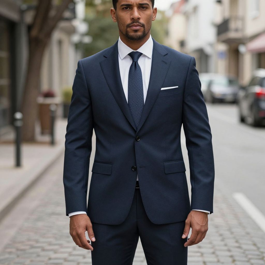 Photograph of a handsome, dark-skinned man with short black hair and a trimmed beard, standing on a cobblestone street in an urban setting. He wears a sharp, navy blue suit with a white dress shirt and a dark blue polka-dotted tie. A white pocket square is neatly tucked into his suit jacket. His expression is serious and confident. The background shows a blurred street with parked cars, trees, and buildings, indicating a city environment. The overall style is modern and professional.