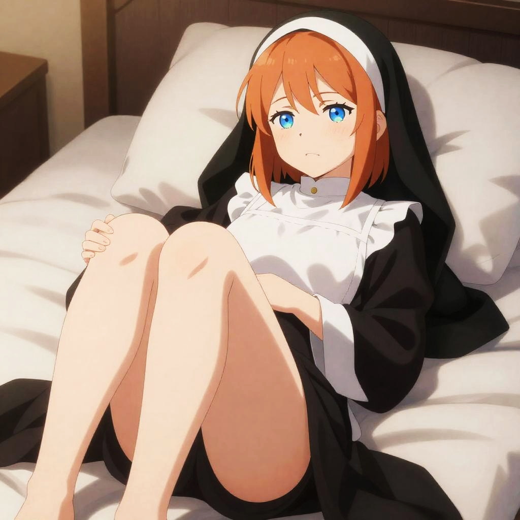 Manguri:1.1 folded holding legs, Shoulders and back of head on the bed, laying on a bed, legs_up knees_on_chest Butt up, spread legs, nun Monastic clothes frock, +++ extremely quality extremely detailed deep-silky-healthy-lackwarm-foundational-soft-skin, anime coloring illustration high resolution, contrapposto glow shine like opal, UC:realistic cute anime face cinematic angle Girl at the front dynamic pose, kawaii 1lady 25yo eyeliner skindantation (a mole under the mouth) medium breasts +++, +++