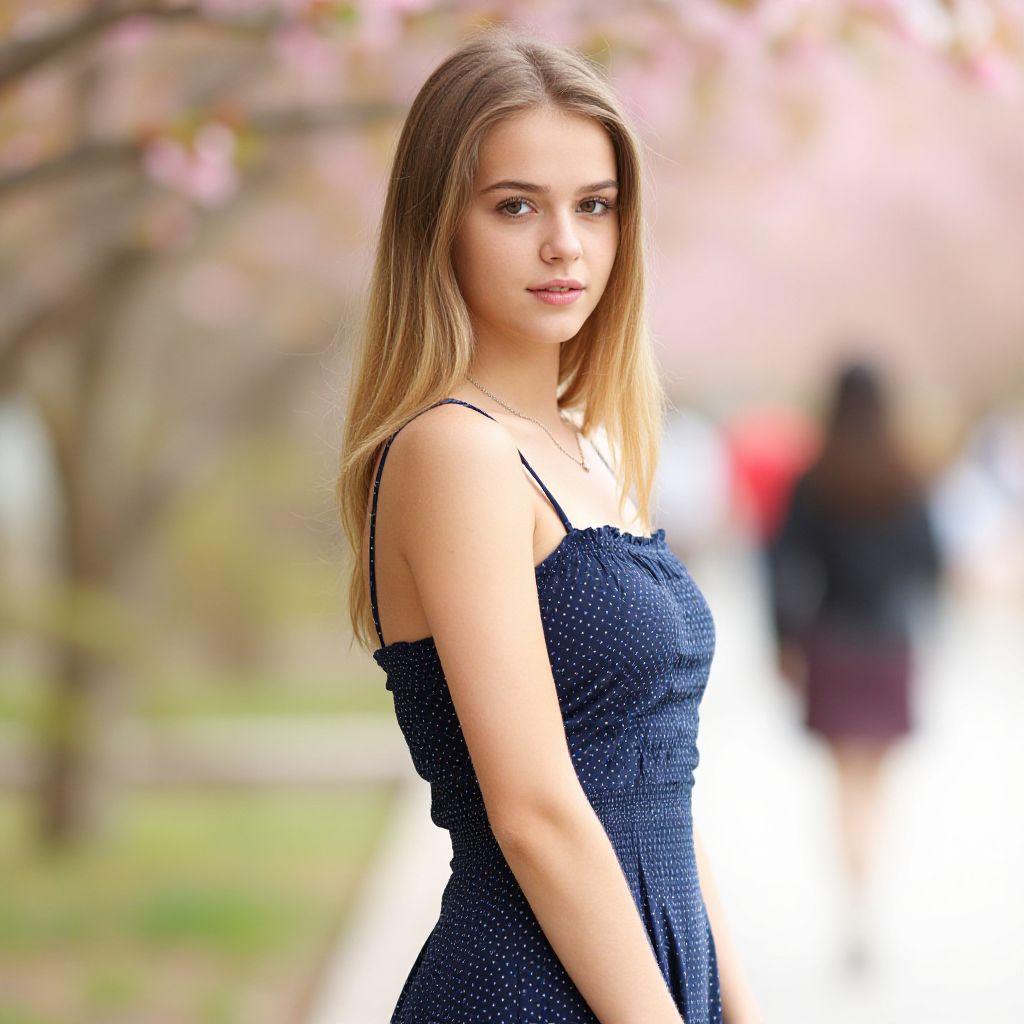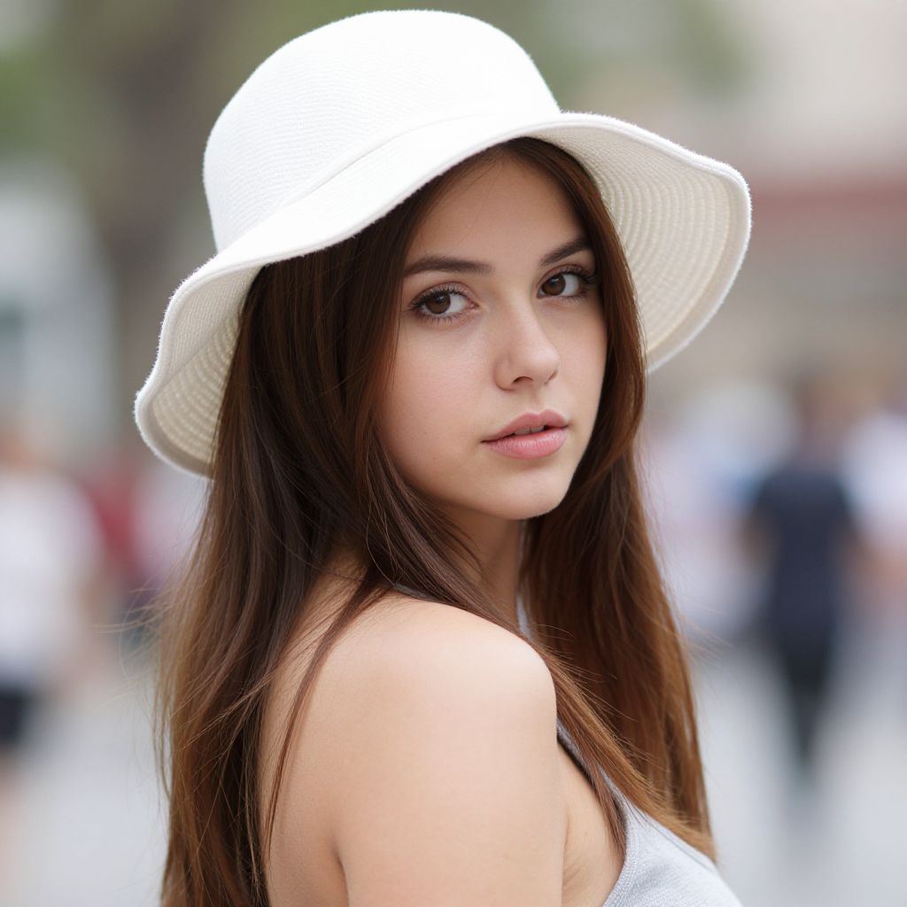 Photograph of a young woman with long brown hair, fair skin, and striking blue eyes, squatting beside a shiny black car. She's wearing a black off-shoulder top, denim shorts, black thigh-high boots, and elbow-length black gloves. Her intense gaze is directed at the camera, and she has a confident, slightly seductive expression. The background is a blurred outdoor setting with a concrete ground.