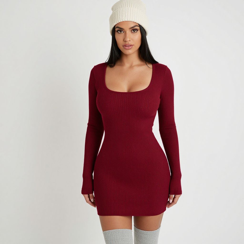 "Woman, casual chic, ribbed knit mini dress in deep red, scoop neckline, long sleeves, fitted silhouette, thigh-length, paired with slouchy light grey knee-high socks, cream-colored knit beanie, white background with soft lighting.. Sexy. Pretty face and beаutiful eyes. Big breasts."
