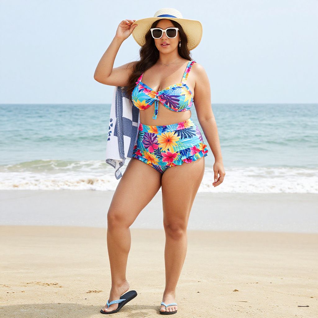 Full body shot, Plus-size woman, vibrant floral tankini, soft stretchy fabric, adjustable straps, matching beach bralette, supportive underwire, high-waisted swim shorts, lightweight quick-dry material, playful ruffles, bold colors, tropical print, comfortable fit, stylish beach cover-up, wide-brimmed sun hat, oversized sunglasses, flip-flops, beach towel draped over shoulder Sexy. Pretty face and beаutiful eyes. Big breasts
