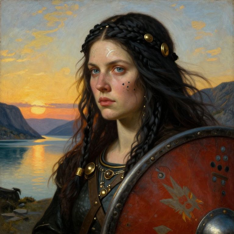 Imagine a hyperrealistic portrait in the style of Renaissance oil painting techniques, depicting a fierce Viking warrior. Her gentle blue eyes stand out against the intricate braided war paint adorning her seasoned face, while her flowing raven hair is accented by golden amulets. The unusual perspective captures her intense gaze as she looks into the distance, as if seen through the lens of one of her battle-worn shields. The emotional gradient is emphasized by the raw intensity of her expression, juxtaposed against the serene backdrop of a tranquil fjord bathed in golden hour light. This evocative and immersive portrait captures the ancient warrior's strength and vulnerability in equal measure.