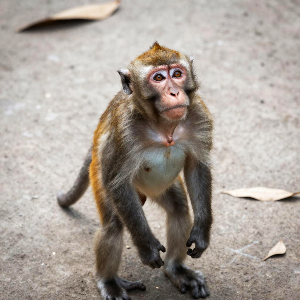 Photograph of a small, brown monkey standing on a dirt ground. The monkey has a light brown and white fur pattern, with its chest and face mostly white. It's looking up with wide eyes, one hand raised slightly. The background is blurry and consists of dirt and scattered leaves. The image has a slightly washed-out, high-contrast effect.