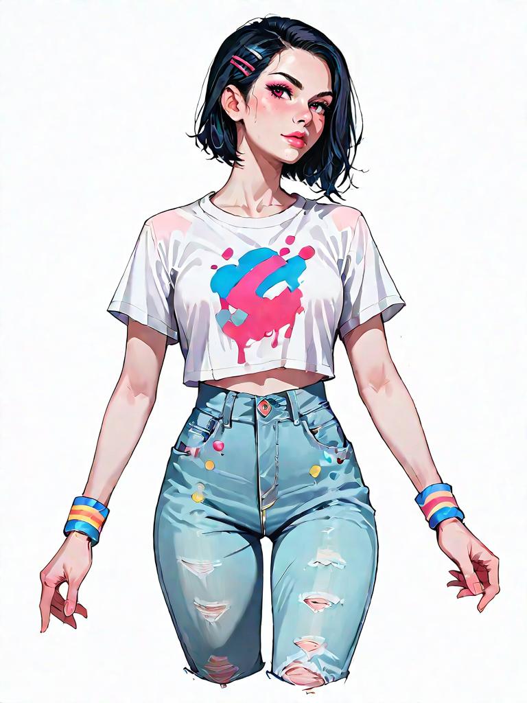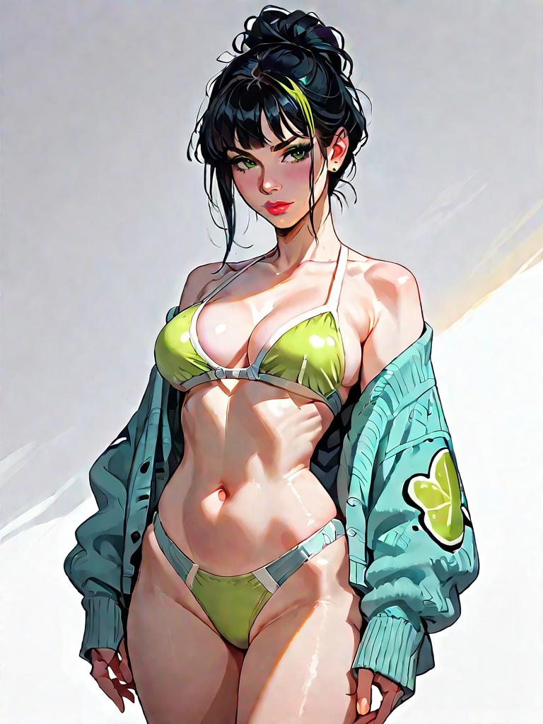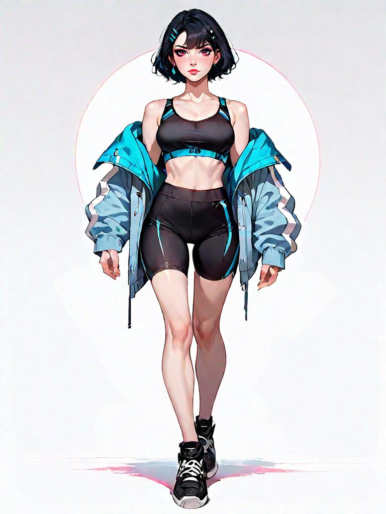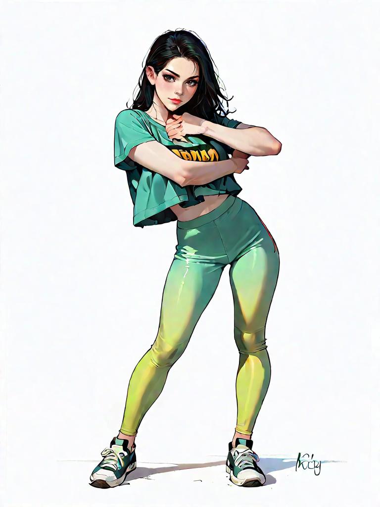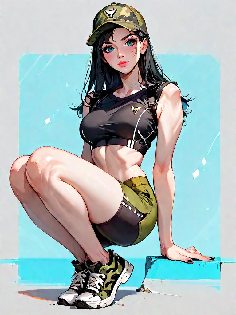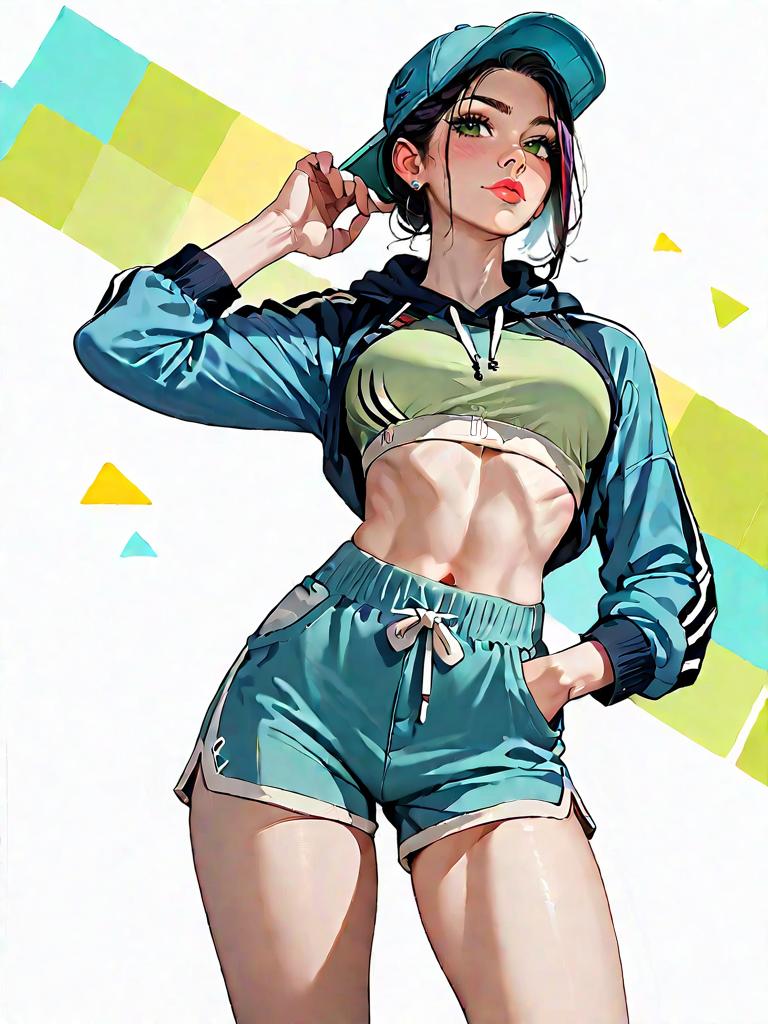 Digital artwork of a fit young woman in athletic wear, featuring an olive green textured sports bra with racerback design and matching high-rise shorts with side pocket. She poses confidently wearing a grey baseball cap, with one hand adjusting the cap and the other in her pocket, set against a white background with colorful geometric accents.