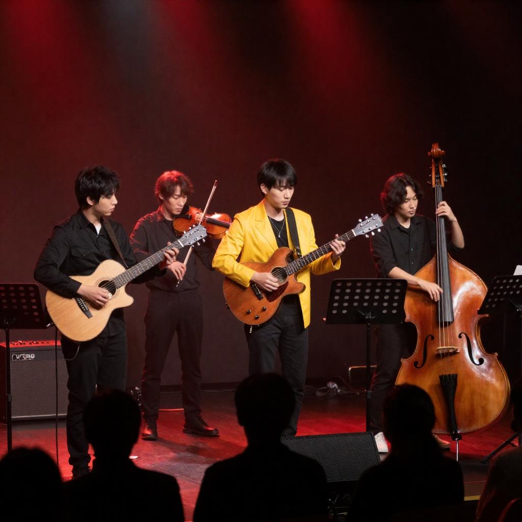 Photograph of a live concert featuring a male guitarist in a red jacket and black pants, standing on a glossy red stage with a bright red background. He plays an acoustic guitar, surrounded by a large orchestra in black attire, including a violinist in a hat. The stage has a reflective surface, and the audience is partially visible in the background.