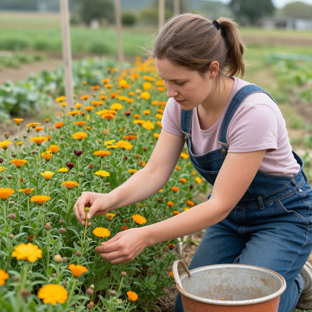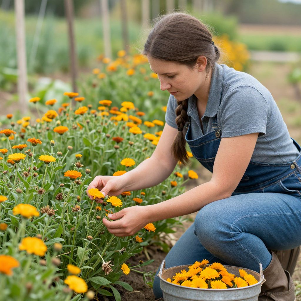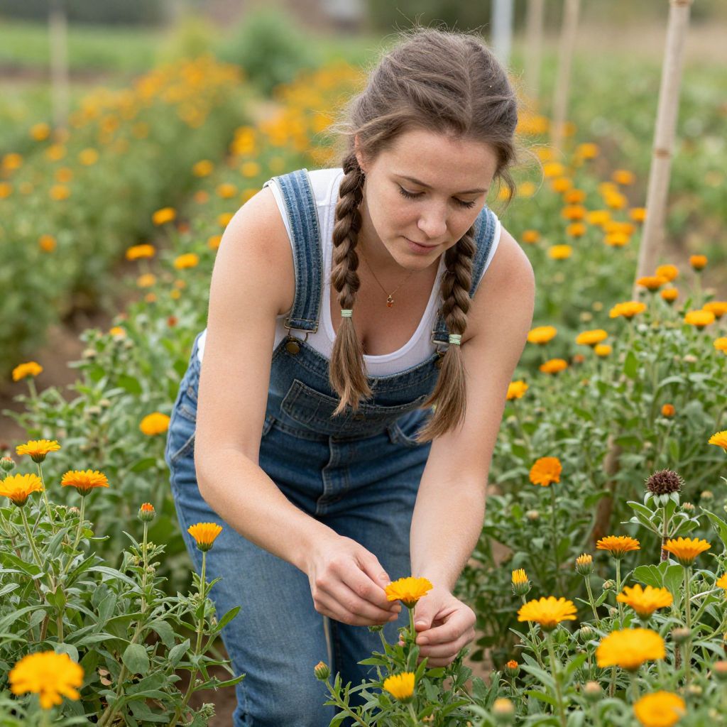 Woman farmer picking calendula flowers on organic farm by Trinette Reed for Stocksy United