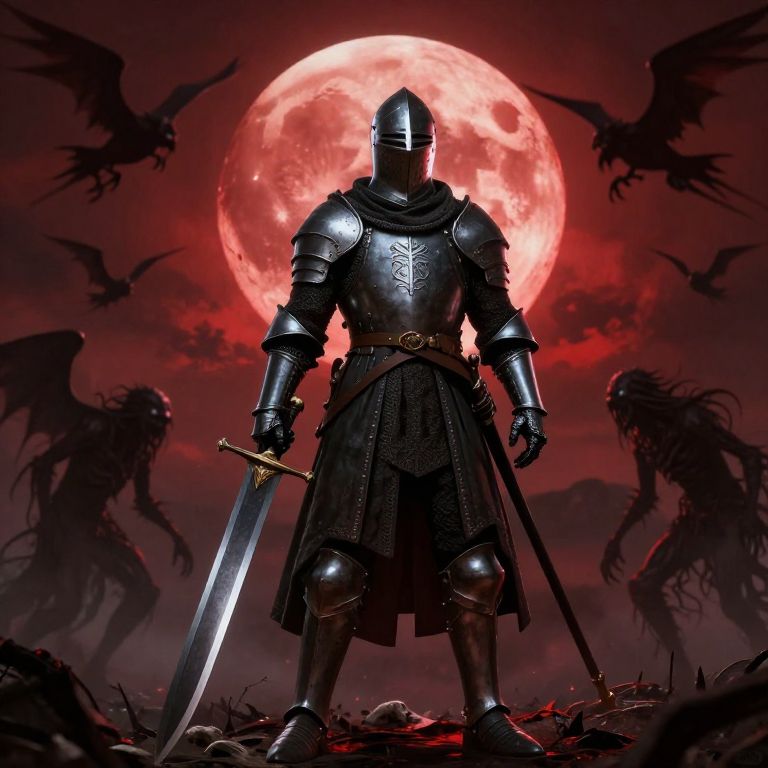 A knight in despair, wielding a large two-handed flamberge, stands against a backdrop of a blood-red moon, with nightmarish creatures flying in the air, in a high-detail, dead world.