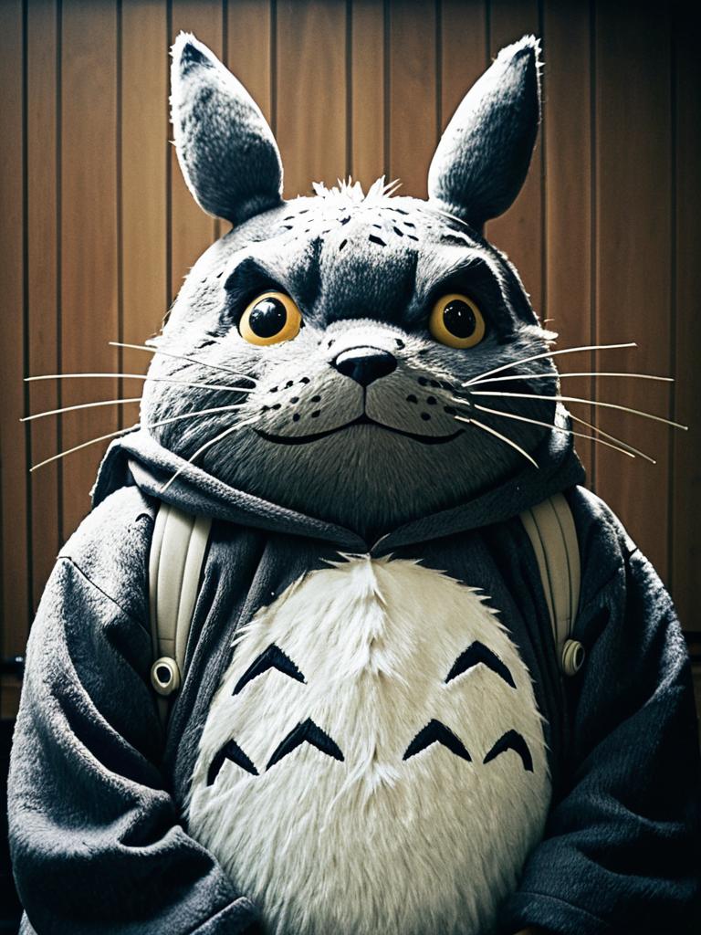 Man in Totoro costume, photorealistic studio cosplay portrait, cinematic tones
