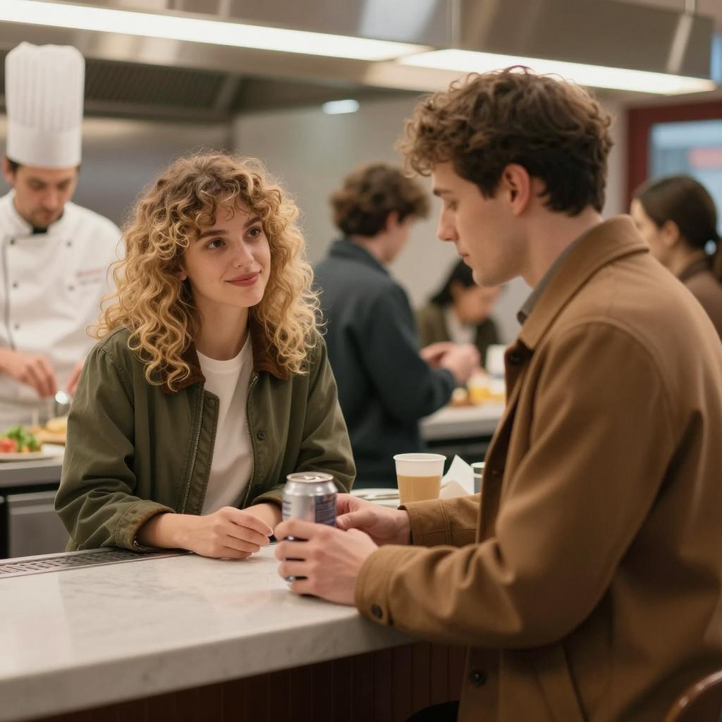 Two people in a dimly lit urban corridor. Foreground: blonde man with curly hair, brown coat, red gloves, holding a bottle, looking left. Background: woman with curly hair, black coat, gray scarf, looking forward. Blue graffiti-covered wall, window with faint light.
